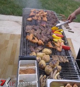 牛肉:牛肉大块约10斤,将牛肉串好置火上烧烤一下,两面撒盐,在锡纸上淋上油,撒上鸡粉,裹紧锡纸,一定要紧,锡纸开口处错开位连续裹6-7层,裹严实,保证不能漏气,上上层烤架烤半天即可。此道菜看似简单操作极难,出炉后里外入味,肉烂汁多,浓香四溢,为各巴西烧烤店镇店招牌。因烤制时间极长,若锡纸漏气,就会肉老干硬,无法下咽。